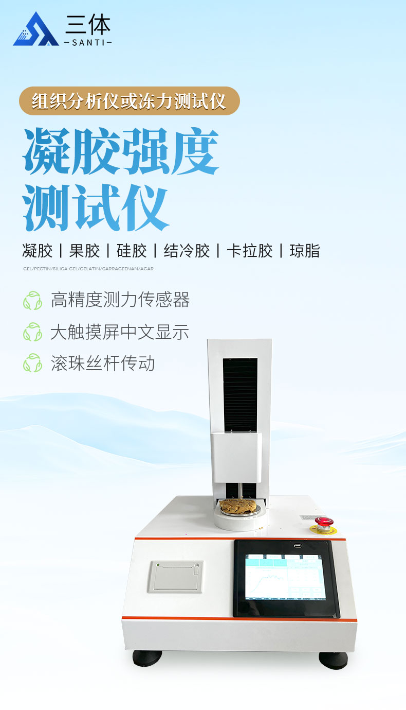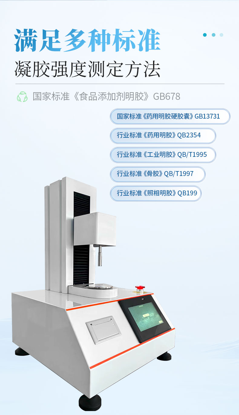 凝膠強度測儀適用于凝膠、果膠、硅膠、結冷膠、卡拉膠、瓊脂、阿拉伯膠、黃原膠、魔芋膠和瓜爾膠等的破裂強度、彈性、延展性、拉伸強度、粘附度、回復性等測試。凝膠強度測儀也叫凍力強度儀 ,明膠凝凍強度測定儀,組織分析儀或凍力測試儀。