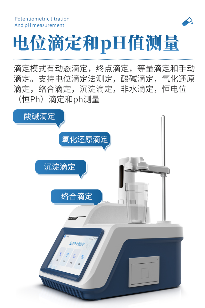 自動電位滴定儀是一種用于化學分析的精密儀器,他通過自動添加滴定劑來確定樣品中特定成分的濃度。該儀器基于電位滴定原理工作,即根據在滴定過程中電池電動勢的變化來確定滴定終點的一款滴定設備。設備滿足國家檢定規程JJG 814-2015《自動電位滴定儀》儀器級別中的0.05級別,即儀器**示值誤差為±1.5%,儀器示值重復性≤0.2%