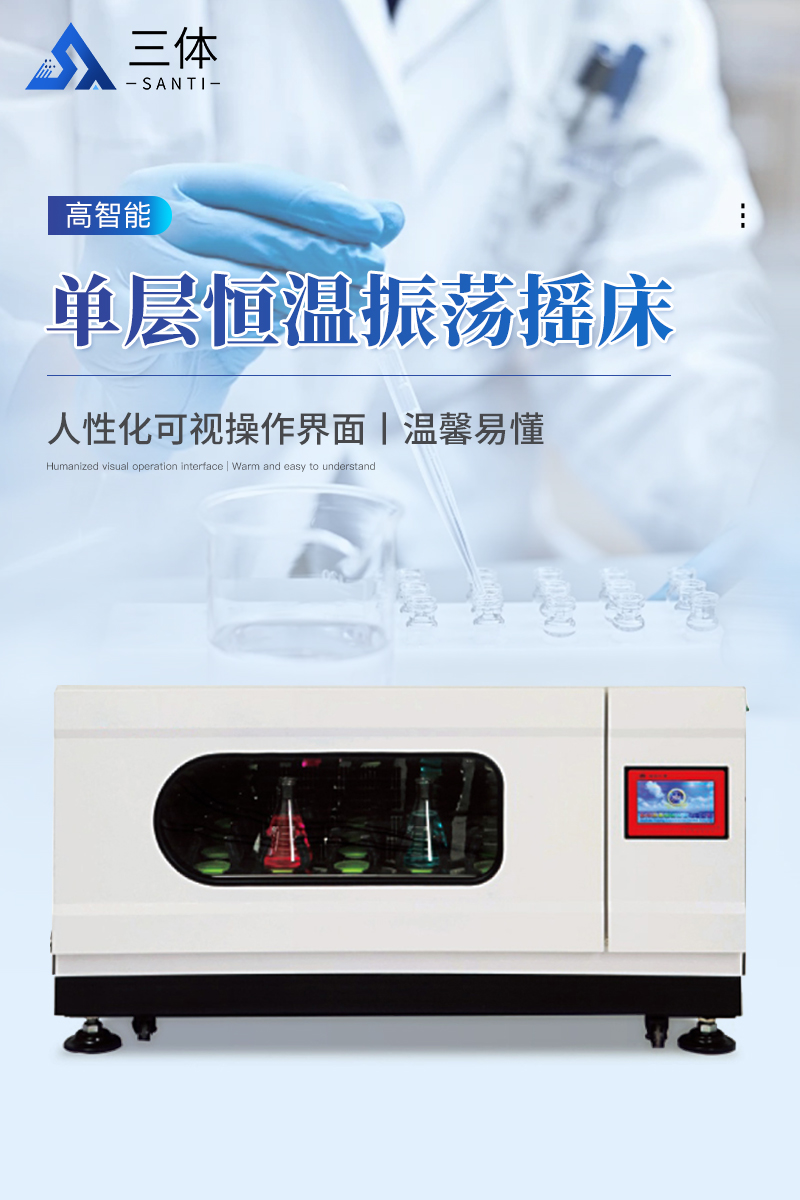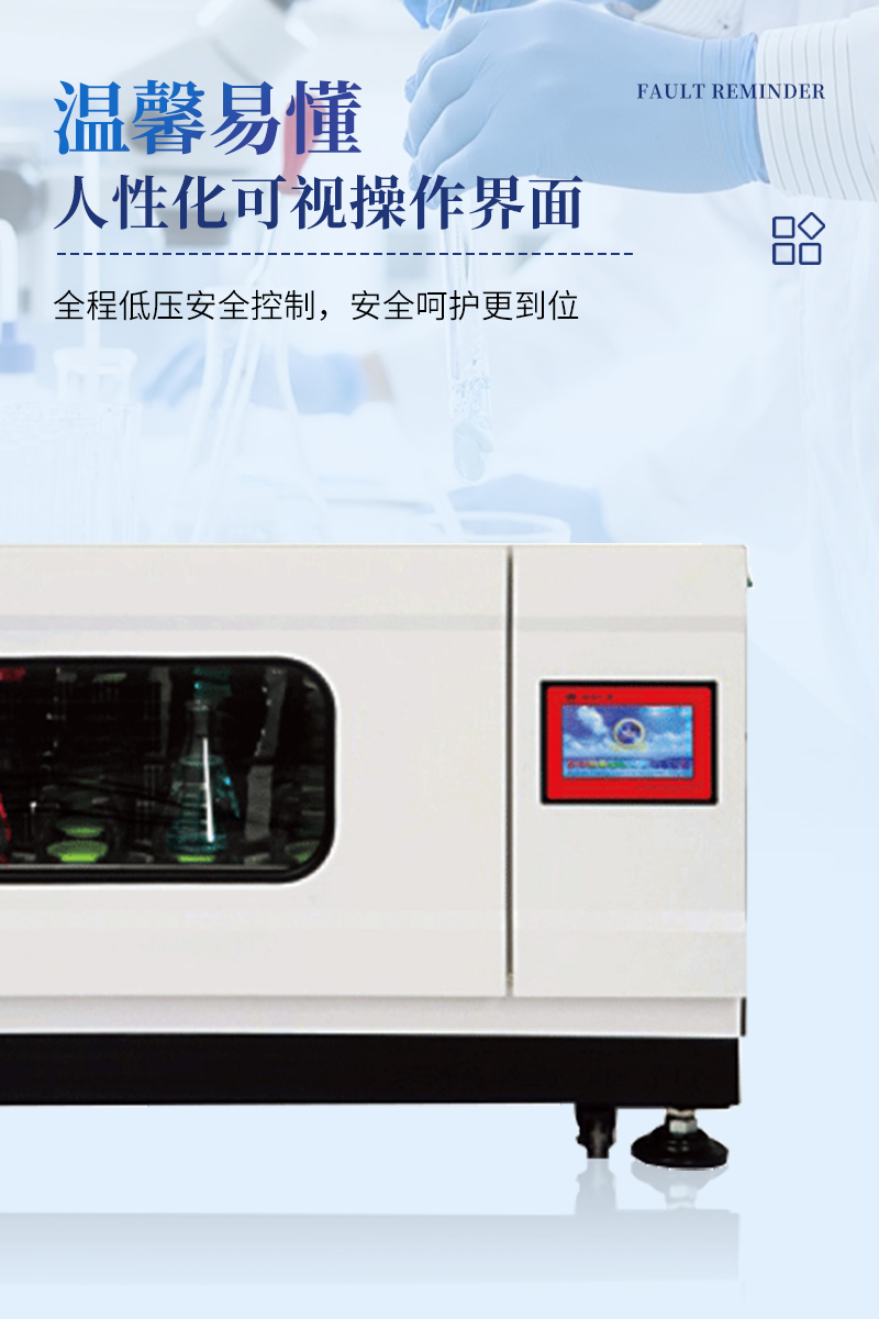 單層恒溫振蕩搖床人性化可視操作界面,溫馨易懂,全程低壓安全控制,安全呵護更到位,可開合式換氣系統,換氣補氧想有就有,高亮鏡面內膽,除菌更輕松。